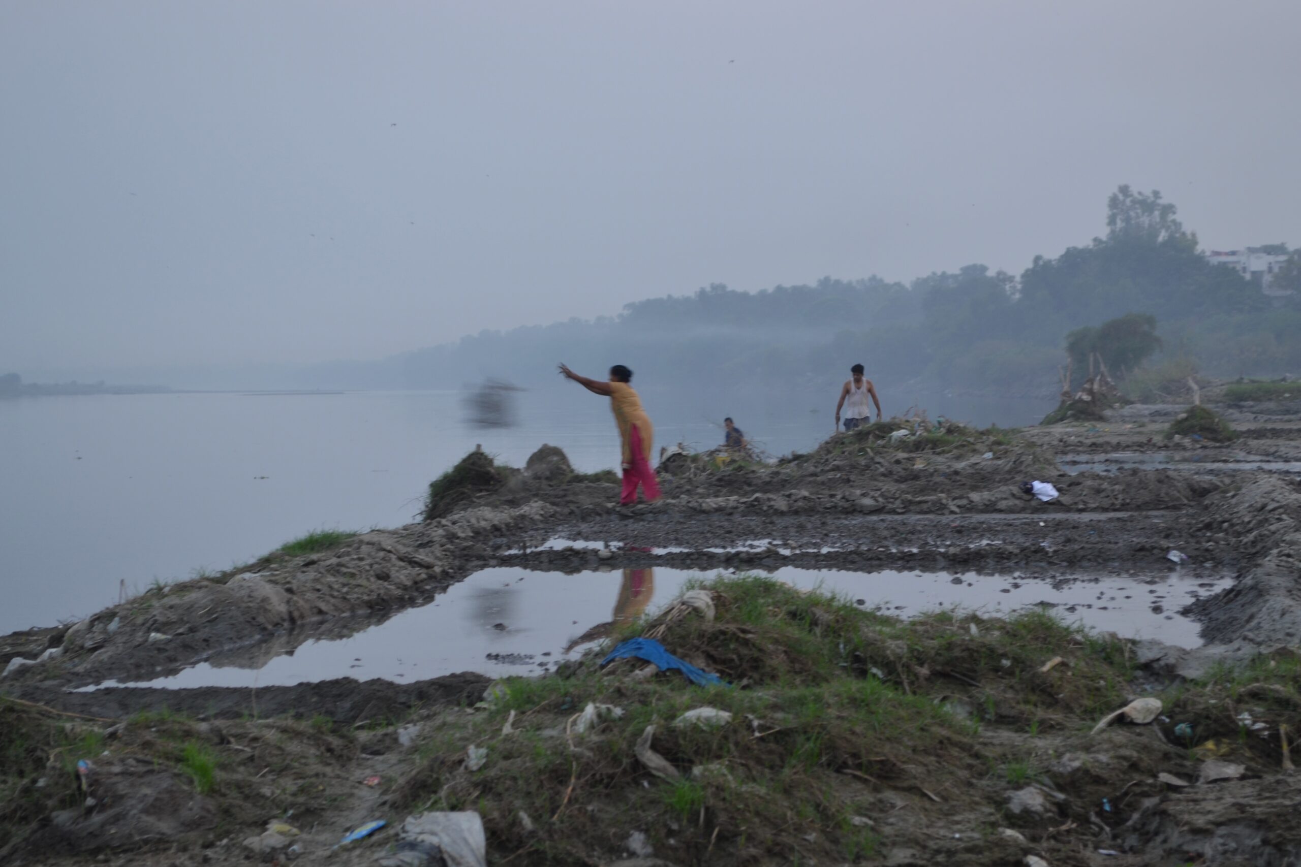 Improvised shacks lean against the concrete flood barrier that separates a narrow strip of fields from the Tibetan colony Majnu Ka Tilla. Sewage from factories and home sanitation systems, which people from the shacks have never had, runs directly into the Yamuna through open drains. The river flows quietly under the smog-shrouded sun. Dogs play and cows lie on the banks.